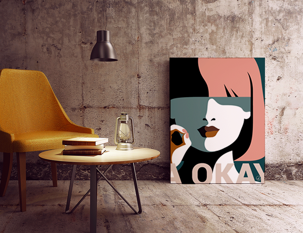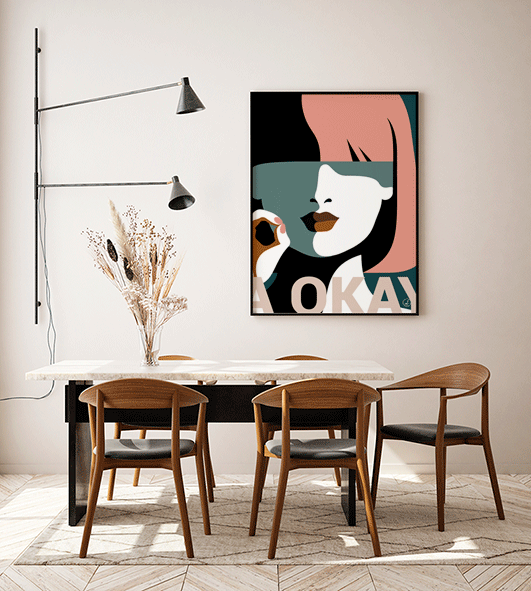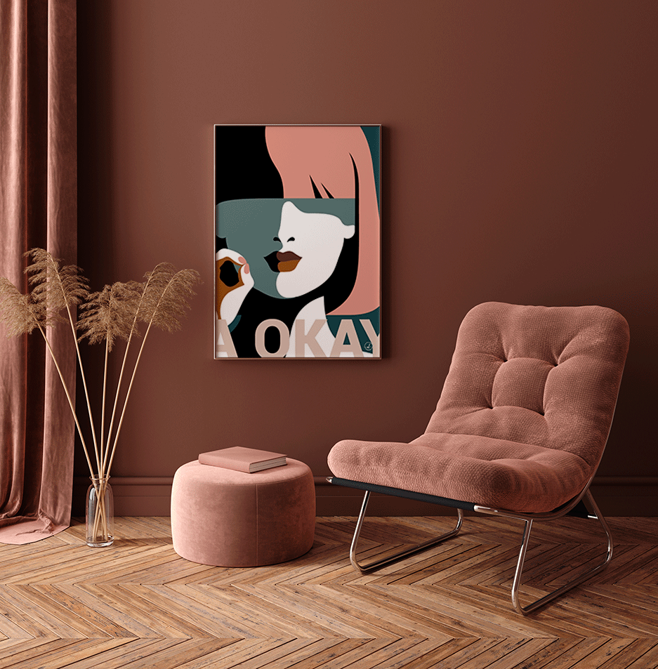 Plakat af grafisk designer Rikke Axelsen. Titel: A-OKAY. Leveres uden ramme på kraftigt papir i 3 størrelser.